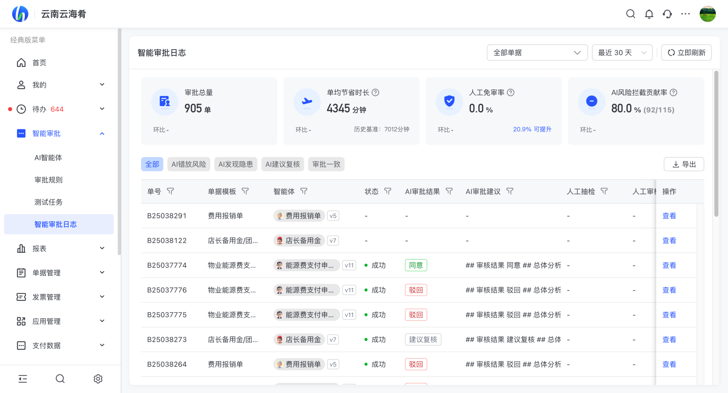 合思团队将云海肴 “餐饮专属财务规则” 转化为 AI 可识别的逻辑,如 “团建费需附人数清单”等隐形规则,均设为系统强制校验项;门店员工无需学习复杂系统,按日常习惯提交单据即可,消除 “不同审核人员理解差异” 的问题,实现 160 余家门店审批标准 100% 统一。