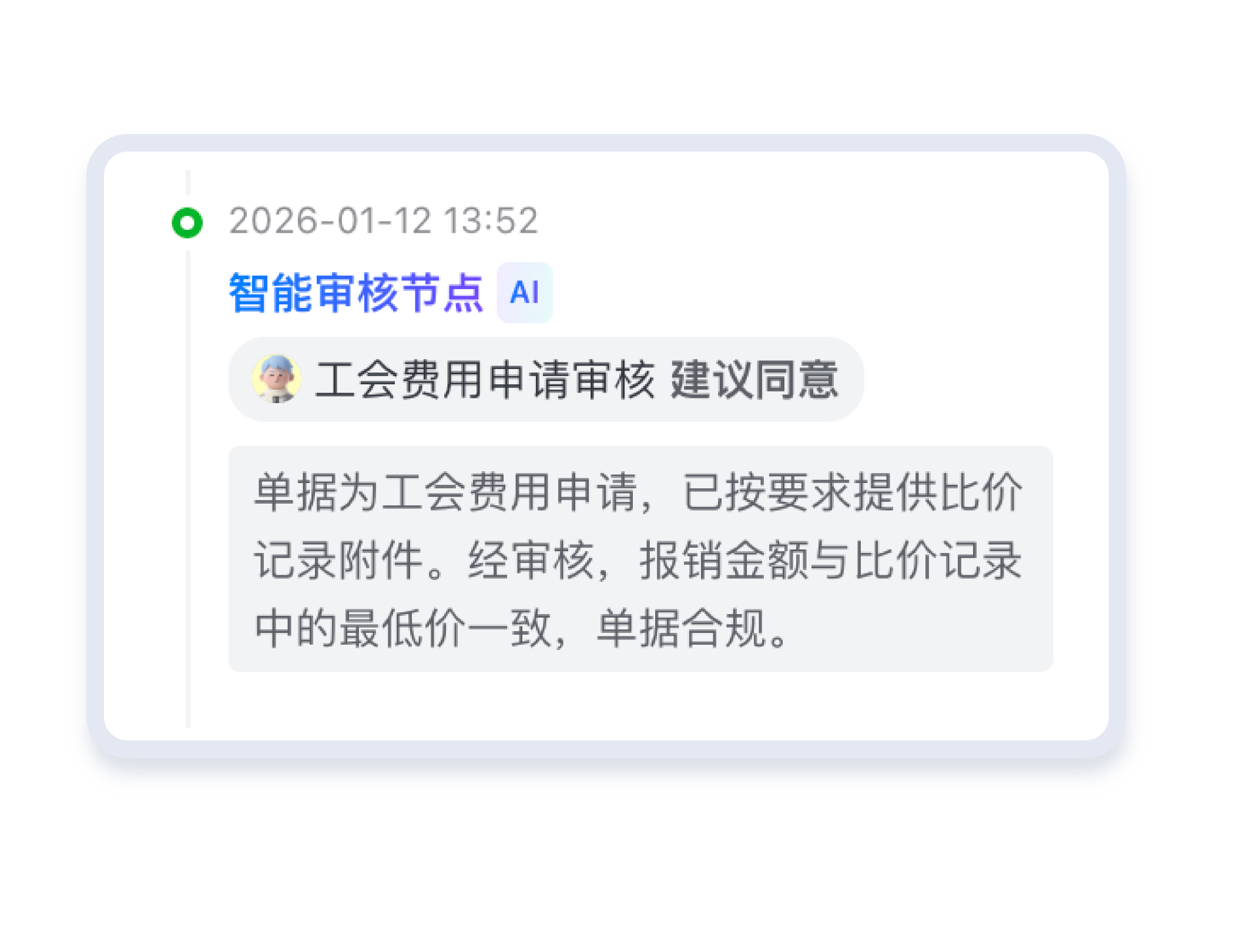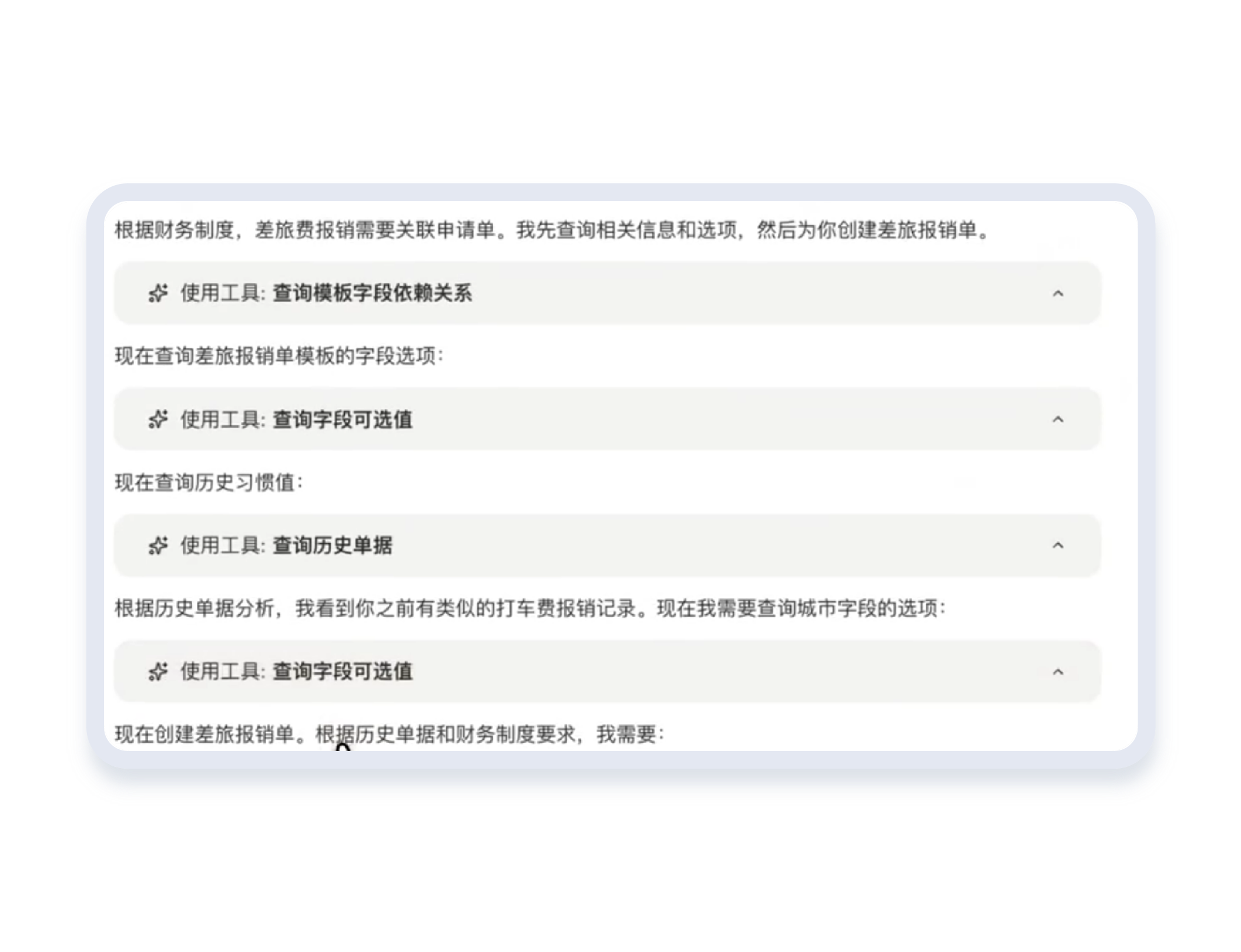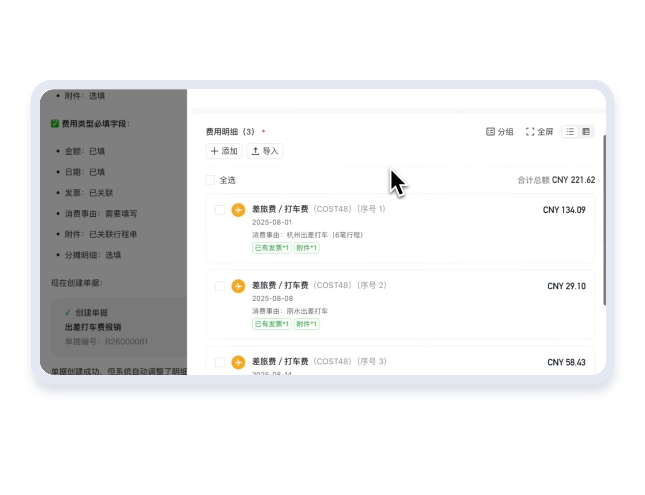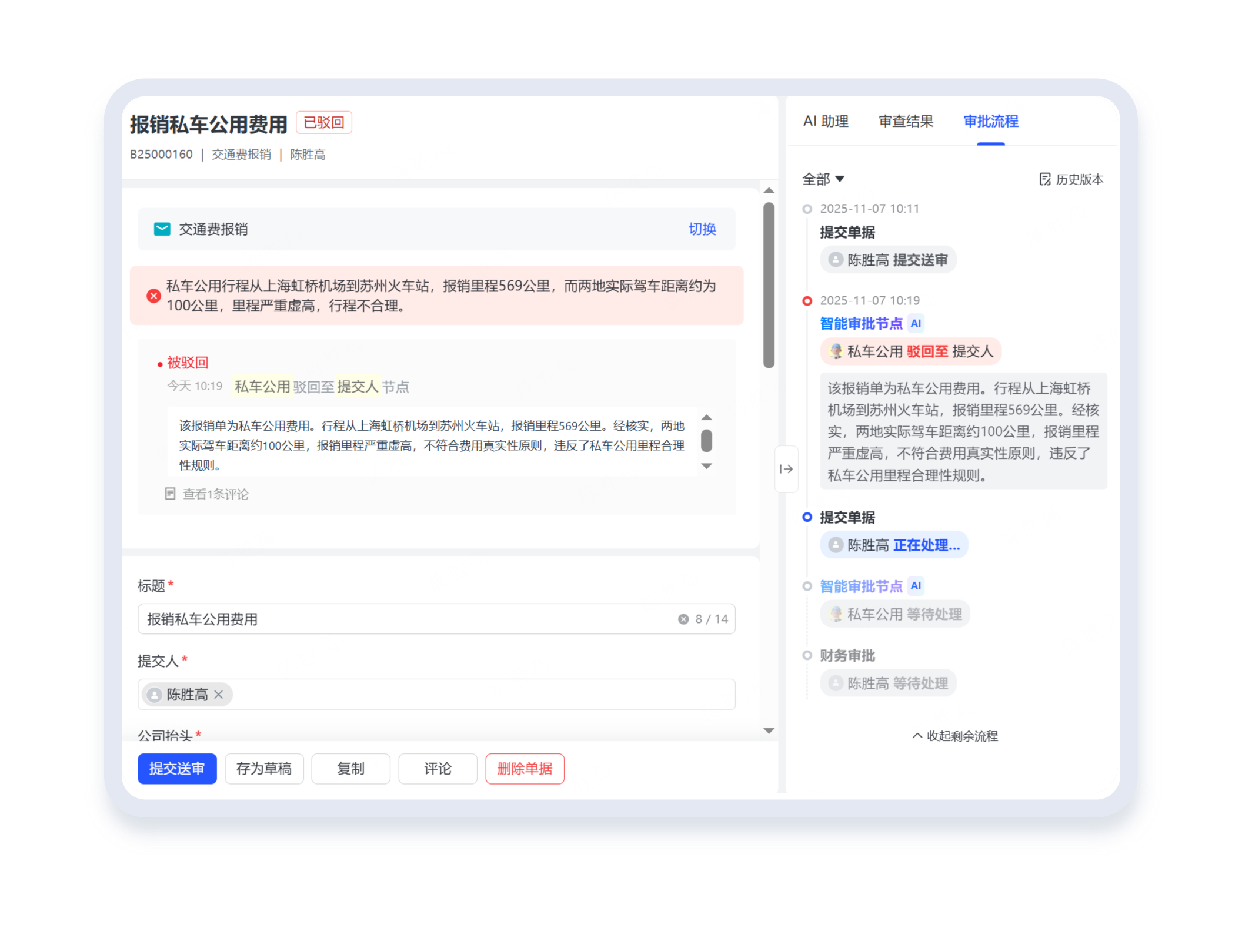 在提报过程中同步校验单据合规性,提前识别不符合企业规则的内容并提示修改,提升单据一次性通过率,减少员工与财务的沟通成本。