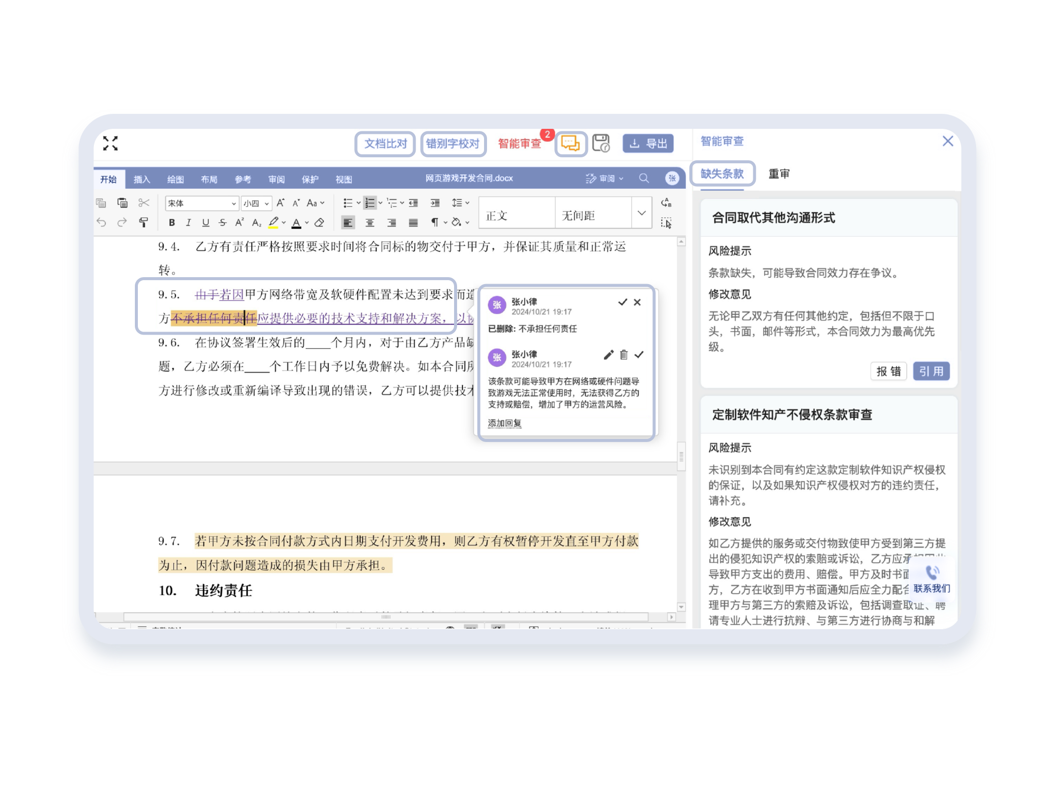 上传合同自动解析条款,支持英翻中双语审查,划词答疑、风险标注 + 修改建议一键完成;智能比对归档合同版本,确保签署版与审核版一致,全链路降低法务风险。