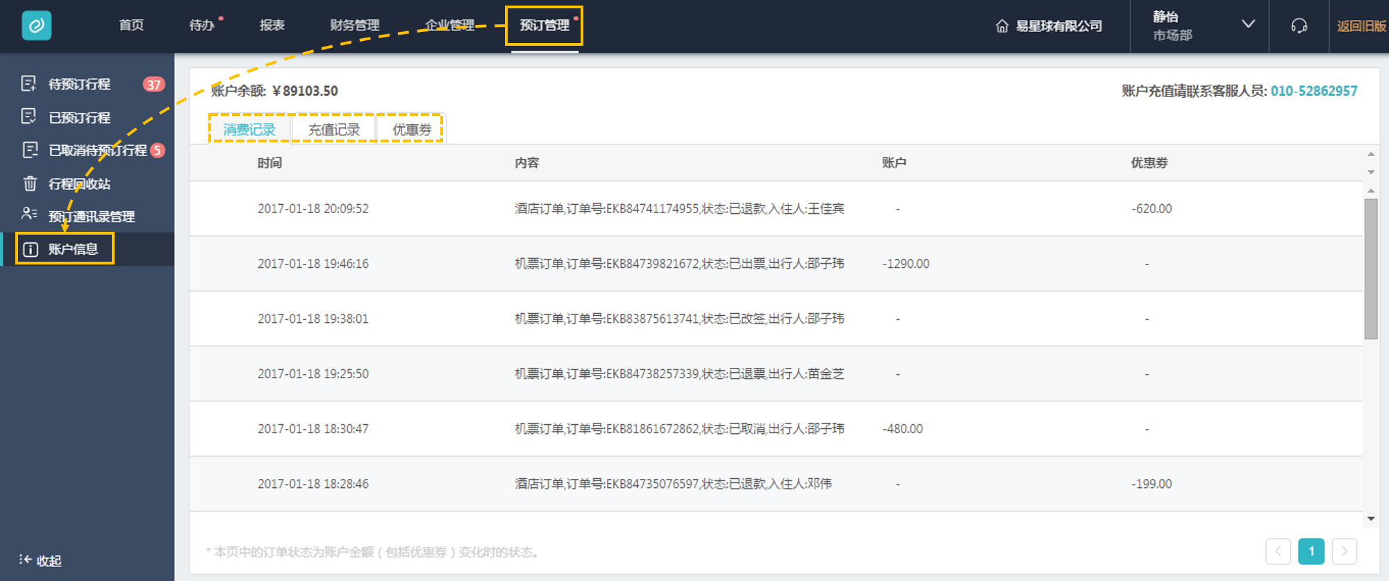1、点击「预算管理」-「账户信息」,可查看企业订购账户余额、消费充值记录及优惠券使用情况。