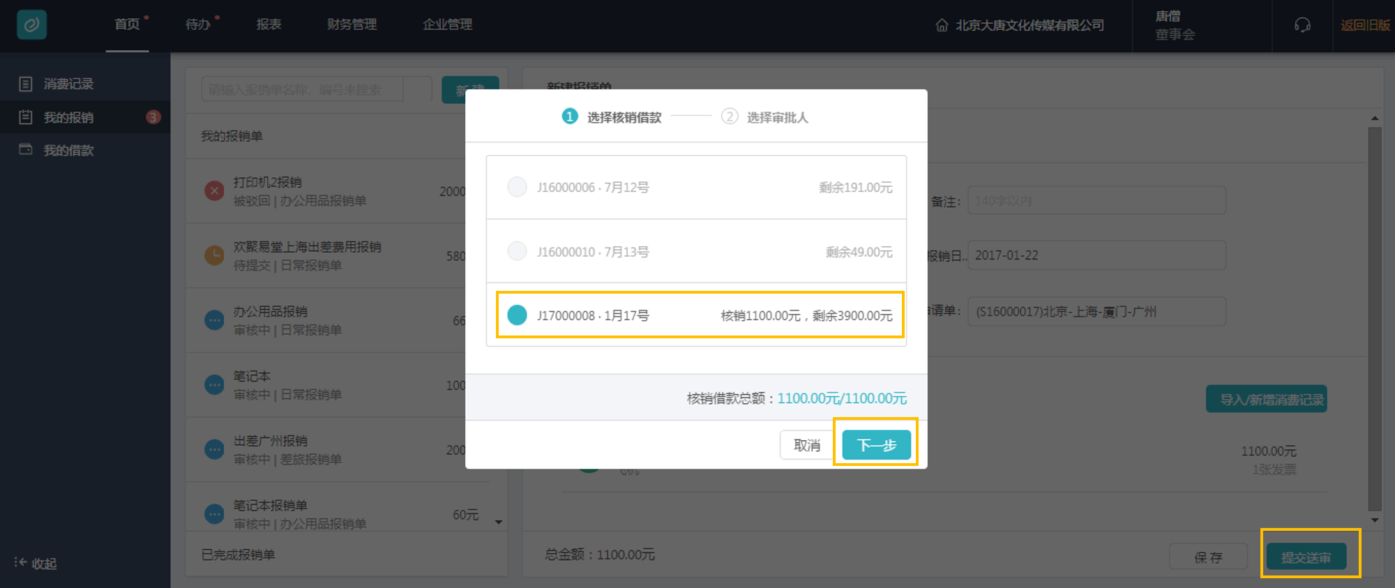 2、提交报销单时,点击「提交送审」,在弹出的借款列表中选择需要核销的借款单,「下一步」并选择审批人即可。