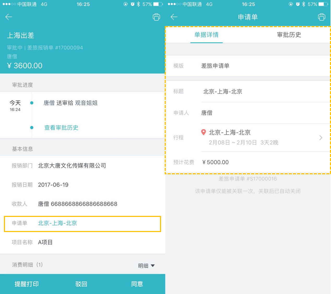 审批人审批时,可点击查看单据所关联申请单的详情。