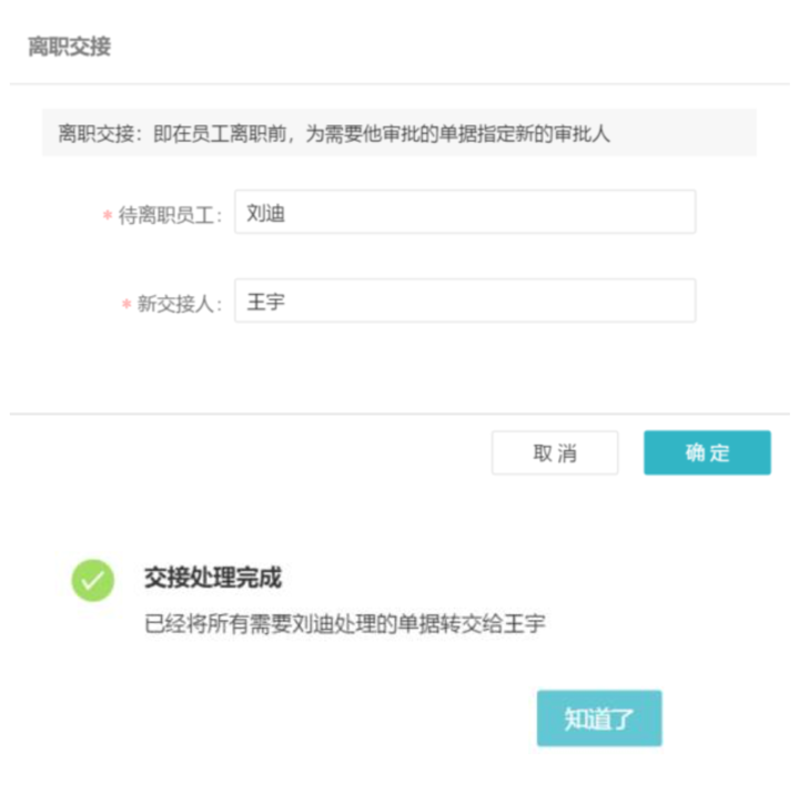 PS:员工离职交接功能也可以作为人员休假工作转交使用,该功能可以将该员工当前名下待审批或流程进行中单据即将审批的单据一次性转交给其他人员进行审批。