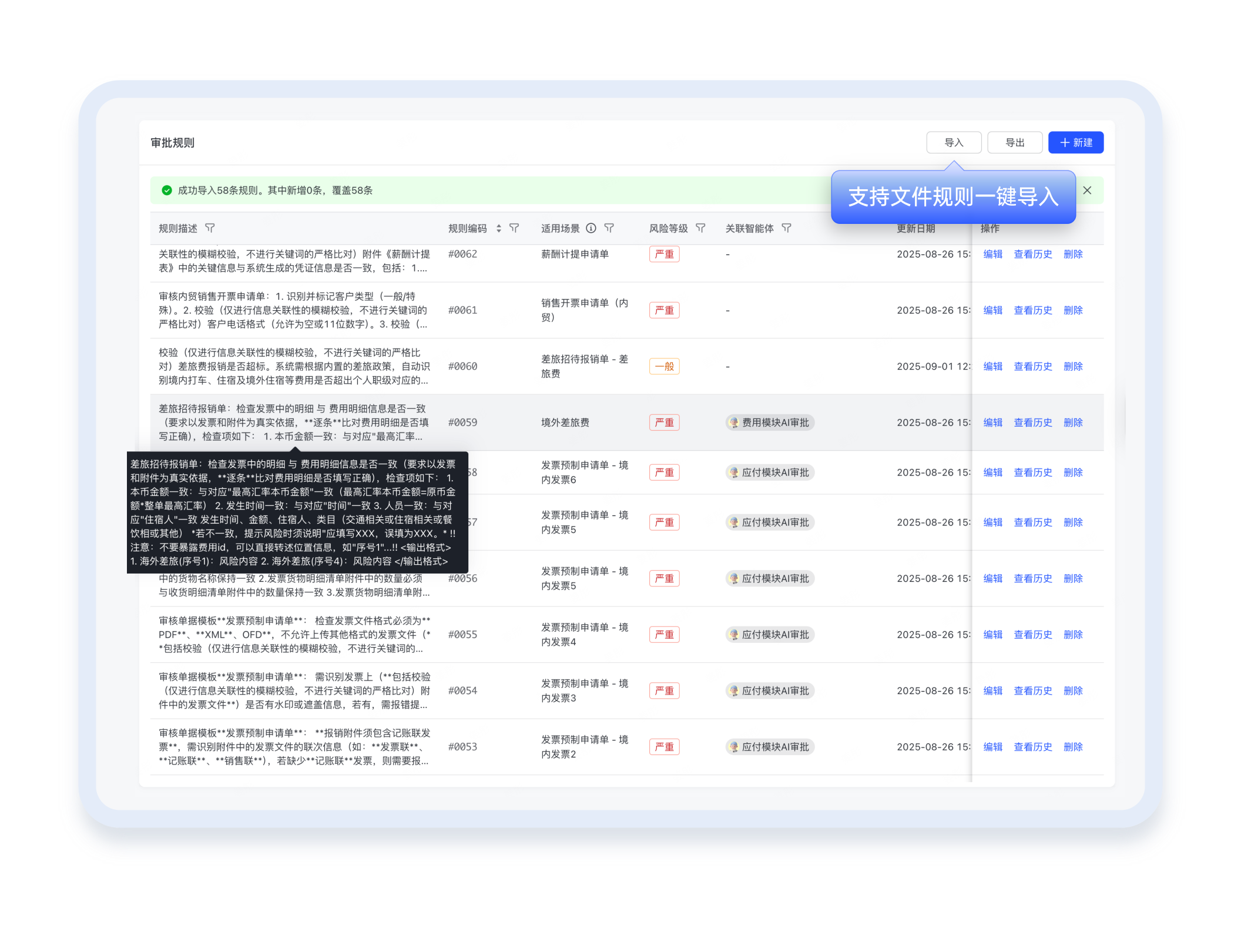 支持上传企业规章制度、报销规则等文档,在线拆解后生成审核依据,告别手动翻条款
