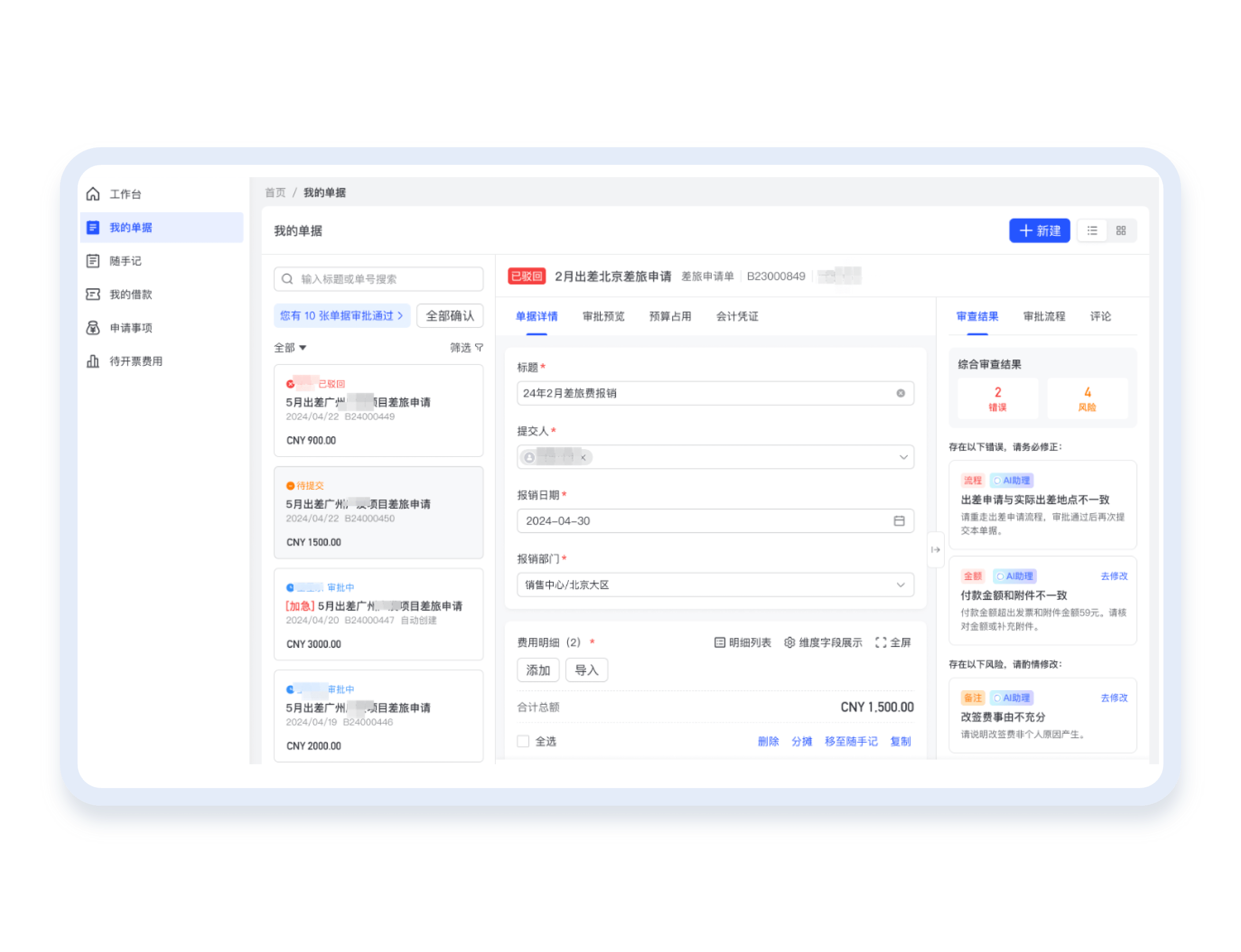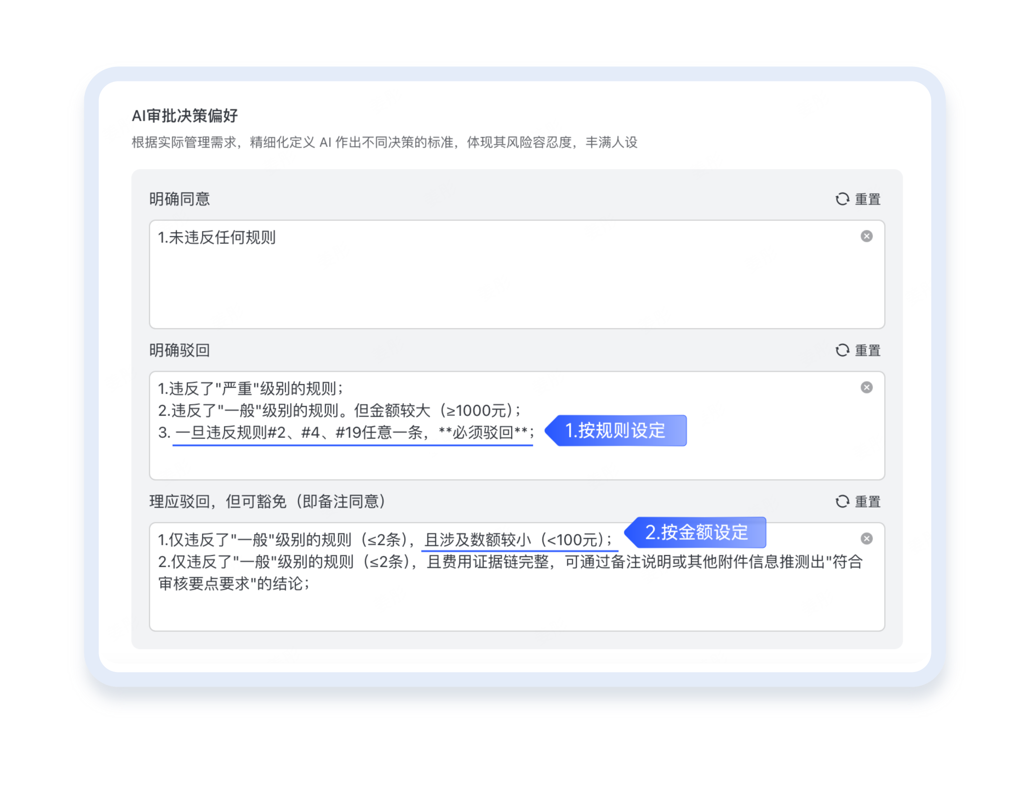 附赠决策建议,可自主设置审批规则,自动驳回问题单据,或仅呈现风险信息供人工决策参考