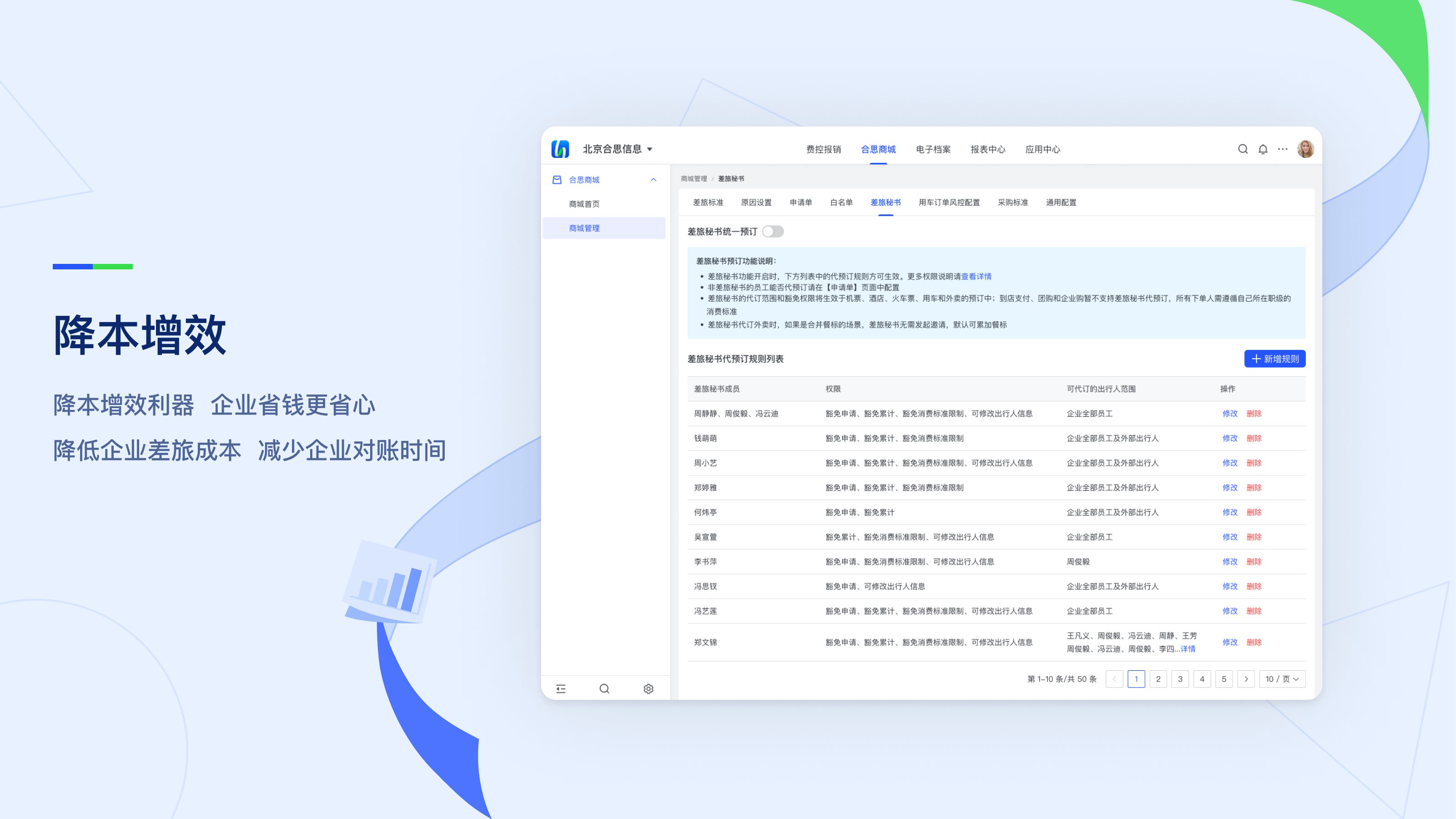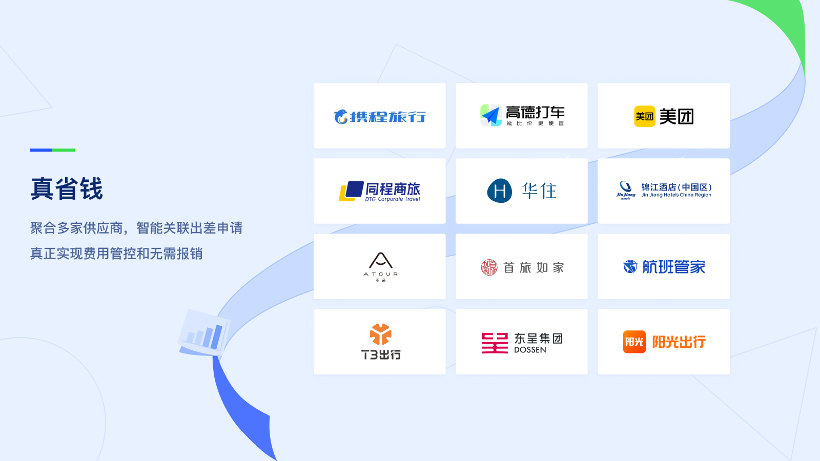 5.超过300家企业的选择,差旅报销降本增效利器,使用企业半年内差旅费用支出同比下降20%,对账时长由7天缩短至1天。