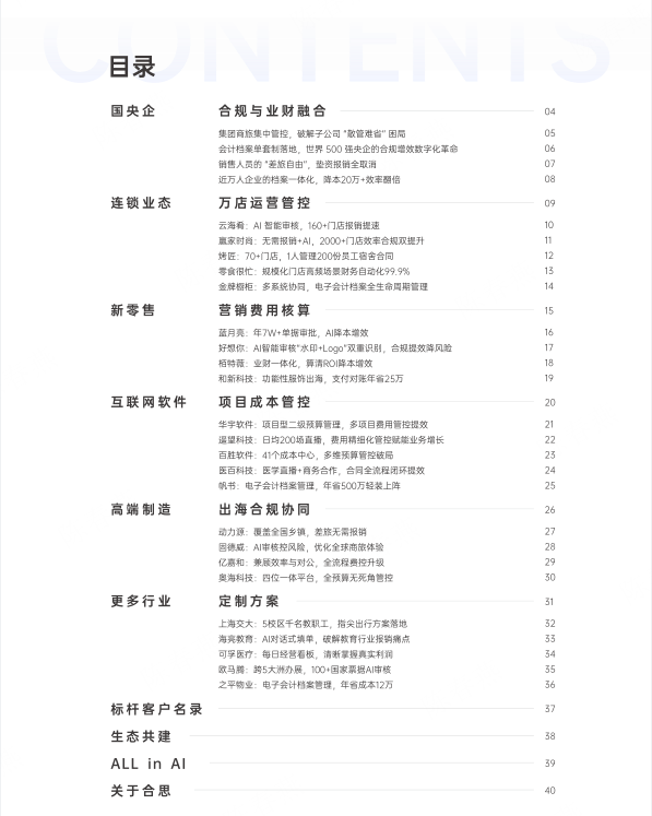 案例集特别新增财务 AI 实战案例,展现财务管理从流程驱动转向模型驱动、从单一效率工具转向智能内控大脑的行业革新,详解各行业客户落地合思方案